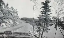 The Heenan Highway would become the first Canadian link to the Rainy River area; before its opening in the mid-1930s, the only way to drive to the area was via the United States.[10] In 1922, Kenora MPP Peter Heenan and Dr. McTaggart approached the government to lobby for construction of a road between Nestor Falls and Kenora.[11] Nestor Falls was the northernmost point accessible by road from the Rainy River area.[12] Heenan would become the Minister of Lands and Forests in Mitch Hepburn's cabinet.[13] This provided the impetus for construction to begin in 1934.[14] Unlike the Cloverleaf Trail, the Fort Frances – Kenora Highway, as it was known prior to its opening, was constructed through the rugged terrain of the Canadian Shield. Rocks, forests, lakes, muskeg, and insects served as major hindrances during construction of the 100-kilometre-long (62 mi) highway, which progressed from both ends. By late 1935, the only remaining gap in the road was the Sioux Narrows Bridge. Construction on this bridge was underway by March 1936; it was rapidly assembled using old-growth Douglas fir from British Columbia (BC) as the main structural members. These timbers were cut in BC, and shipped to be built on-site like a jig-saw puzzle. The bridge was finished on June 15, 1936, completing the link between Fort Frances and Kenora.[8][15]