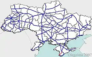 Main route and connections to/intersections with other highways in Ukraine.[2]