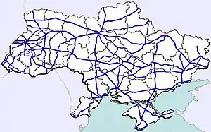 Highway M20 is the second shortest Ukraine international highway (M-highway) which connects Kharkiv to the border with Russia at Hoptivka in Kharkiv Raion in Kharkiv Oblast (Kharkivshchyna) (Ukrainian: Дергачівський район, Ха́рківська о́бласть (Харківщина)) and Nehoteevka in Belgorodsky Raion in Belgorodskaya Oblast (Russian: Нехотеевка, Белгородский район, Белгоро́дская о́бласть).[1] The section from Lisne to the Russian border is part of European route E105, known as the Crimea Highway (Крым шоссе) in Russia.[2]