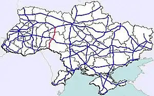 M21 is a Ukrainian international highway (M-highway) which connects Zhytomyr and Vinnytsia to the border with Moldova.[1] The highway also connects two major transnational corridors, Pan-European Corridor IX and the transportation corridor "Europe-Asia". The entire route is part of European route E583.[2] The section from Zhytomyr to the Belarusian border was previously P28.