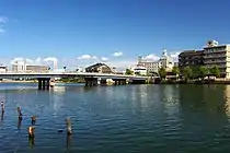 The accumulation of sediment in the riverbed increased the flood hazard, causing the locals to construct consequently elevated river banks. As a result today the river flows higher than the surrounding land, at some points the riverbed is elevated 3–4 m above the nearby plain. It is an example of a raised-bed river (天上川, tenjougawa), which are common in Japan. The accumulation of sediment in lake Shinji stopped the outflow into lake Nakaumi, transforming the former into a freshwater lake.[13][6][24][25] In order to both prevent flooding and expand the agricultural land, in the 17th - 19th centuries the river was artificially diverted every 40–60 years; that was called the kawa-tagae (川違え) technique.[7] The greatest change came in 1924 with the dredging of Ohashi River that connected again the lakes Shinji and Nakaumi.[13][6] In addition, the dams built since the 1960s reduced the volume of sediment transported by the river.[26]