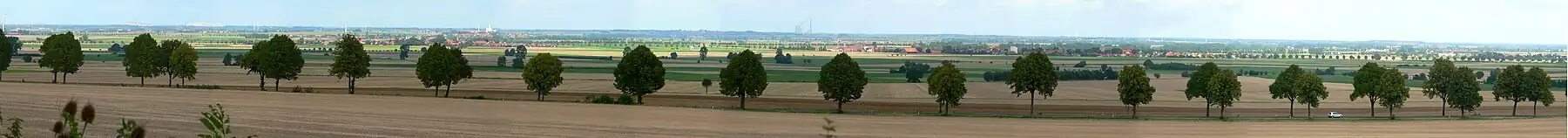 The region has a gently undulating landscape with low hills. Large areas are used for arable farming and woods are rare in the Börde due to the intensive way in which the land is used, so much so that it is sometimes referred to as a 'wheat or sugar beet steppe'. Most of the trees are isolated and only hedges and bushes along the roads and streams break up the scene. Most of the settlements are clustered villages (Haufendörfer). Their houses were built close together in order not to waste valuable farmland.