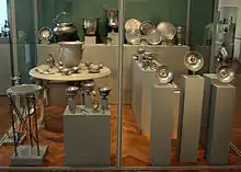 The Hildesheim Treasure, unearthed on October 17, 1868 in Hildesheim, Germany, is the largest collection of Roman silver found outside imperial frontiers.[1] Most of it can be dated to the 1st century AD.[1] The trove consists of about seventy exquisitely crafted solid silver vessels for eating and drinking and is now kept in the Antikensammlung Berlin (Altes Museum). It is generally believed that the treasure was the table service of a Roman commander, perhaps Publius Quinctilius Varus,[1] who was militarily active in Germania. However, others also suggest that the treasure may have been war spoils rather than table service.[2]
