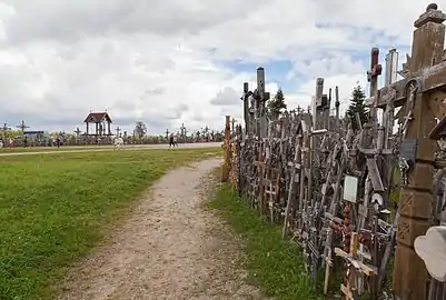 Hill of Crosses (Lithuanian: ⓘ) is a site of pilgrimage about 12 km north of the city of Šiauliai, in northern Lithuania. The precise origin of the practice of leaving crosses on the hill is uncertain, but it is believed that the first crosses were placed on the former Jurgaičiai or Domantai hill fort after the 1831 Uprising.[1] Over the generations, not only crosses and crucifixes, but statues of the Virgin Mary, carvings of Lithuanian patriots and thousands of tiny effigies and rosaries have been brought here by Catholic pilgrims. The exact number of crosses is unknown, but estimates put it at about 55,000 in 1990[2] and 100,000 in 2006.[3] It is a major site of Catholic pilgrimage in Lithuania.
