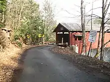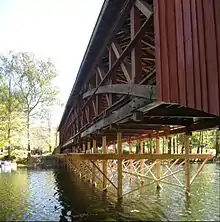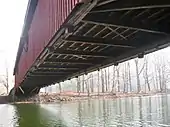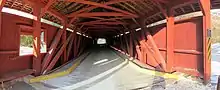 The covered bridge rests on abutments of stone and mortar, which have been reinforced with concrete. There are no parapets.[4] The bridge beams are reinforced in places with steel beams.[20] The bridge deck is made of crosswise "narrow width laid flooring".[21] Wheel guards on the deck separate the roadway from the pedestrian walkways on either side and protect the sides, which are covered with "vertical board and batten siding" almost to the eaves.[4] The interior and exterior are painted red. The bridge has long, narrow windows with wooden shutters: the south side has three windows, and the north side has two. An opening between the eaves and the siding runs the length of the bridge on both sides. The gable roof is wooden shake shingles. The bridge is supported by a Burr arch truss, and is similar in design and construction to the one in Forksville.[4] The western end of the Hillsgrove bridge lies against a steep hillside,[21] and those approaching the bridge from the west must make a sharp right turn to enter it.[17] Prior to the 2010 restoration, the sides were unpainted, but the portals were painted red, while the gable roof was sheet metal which had been installed over the original wooden shake shingles.[4]
