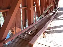 Bridge interior view (in 2015) showing Burr arches and King posts, the wooden beams bolted to the floor on each side are the wheel guards.