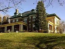 The 2½-story mansion is a brick structure built on a limestone foundation. It follows a rectangular plan that features projecting semicircular bays or rectangular pavilions at the corners on the east and west sides. The home features a porte-cochere on the north side and porches on the east and west sides of the building. There is a porch that faces the south side that runs the length of the house whose floors are of hand-made mosaic tile. There is also a two-level projecting pavilion; the upper part of which was enclosed in the 1920s. The front columns are 30 feet (9 m) in height and feature fluted Ionic capitals. All of the secondary columns on the house are 15 feet (5 m) high.[4] The structure is capped by a decked hipped roof with roof dormers that feature semicircular pediments above round arch windows. At the roofline is a copper cornice. The interior of the home features many of original architectural features, which include stained glass, three fireplaces, tapestry walls, pocket doors, and mahogany woodwork. The house is situated on a corner lot at the top of a bluff with a commanding view of the river.