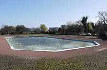 Plans for development of the lido were agreed in 1932[2] and the lido opened on 24 July 1935.[3] The architect for the lido was Joseph Parkin.[4] The pool originally used seawater, converting later to freshwater, and the lido design included two large fountains which have been retained but are no longer used.[5][6] The Main Pool and changing facilities were designed for the use of 768 adults and 180 children with accommodation for around 1000 spectators. In 1936 the Lido was visited by the British diving team from 1936 Summer Olympics who gave a demonstration on 31 August[7] During World War 2 the main pool was closed to the general public and was given over to the use of the various military units in the area.[8] Between 1946 and 1951 a miniature railway ran along the lido site.[9] In 1974 the Lido was used as a set for the Bernie's Holiday Camp scene in the film Tommy.[10] Later in the 70s the lido's diving platforms were removed.[11] In 1995 the Lido lent its name to the Vulcan Software management simulation game Hillsea Lido.[12]