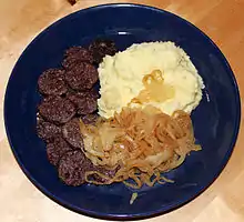 Himmel und Erde ('Heaven and earth') is a traditional German dish of mashed potato with stewed apples. It is frequently served with sliced blood sausage.