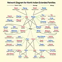 The kinship terms of Hindustani (Hindi-Urdu) differ from the English system in certain respects.[1] In the Hindustani system, kin terms are based on gender,[2] and the difference between some terms is the degree of respect.[3] Moreover, "In Hindi and Urdu kinship terms there is clear distinction between the blood relations and affinal relations."[4]