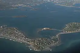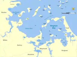 Hingham Bay is the easternmost of the three small bays of outer Boston Harbor,[1] part of Massachusetts Bay and forming the western shoreline of the town of Hull and the northern shoreline of Hingham in the United States state of Massachusetts.[2] It lies east of Quincy Bay and is met at the southwest by the mouth of Weymouth Fore River, also forming part of the waterfront of Weymouth.[2] The bay is home to several of the Boston Harbor Islands.[1]