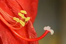 The stamen filaments are filiform and either declinate-ascending or straight and arranged in two to four series (2- or 4-seriate). The stigma is usually either trifid or obscurely trilobed, but some taxa (Famatina herbertiana, and certain Hippeastrum species) have a capitate stigma. The style is either declinate or straight. Chromosome number: 2n = 12–60.[2]