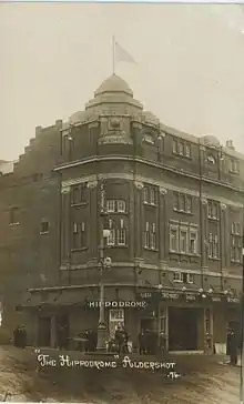 Located on the corner of Station Road and Birchett Road in Aldershot, and replacing a group of derelict buildings which dated to the late 1850s,[2] the Hippodrome was built for Clarence Sounes and was designed by the leading English theatre architect Bertie Crewe. It was a sister theatre to the Kingston Empire at Kingston upon Thames, which had opened in 1910.[3]