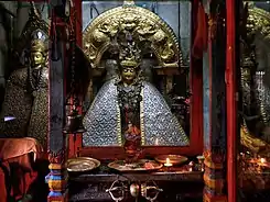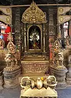On the courtyard side the entrance is flanked by two golden elephants standing on tortoises. Above the door is a gilt copper torana. This torana was originally located at the main shrine, but was replaced there by a silver copy, donated during the reign of king Prithvi Bir Bikram Shah (1881-1911).[10]