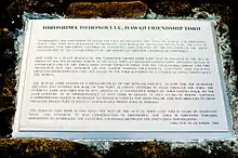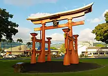 The Hiroshima to Honolulu Friendship Torii is a half-size replica of the torii at Itsukushima Shrine (Japanese: 厳島神社 Itsukushima-jinja) located in the Mōʻiliʻili Triangle Park of Honolulu, Hawaii. The replica torii was presented as a gift from Honolulu's sister-city, Hiroshima, where the original torii is located.[1] Although intended as an offering of friendship, this torii caused controversy for using state funds to pay for a religious monument.[2]