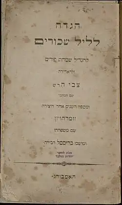 • Hagadah le-leil shikorim [Haggadah for the Night of Drunkards] (in Hebrew and Aramaic). Hamburg. 1842. A humorous parody of the Passover Haggadah for Purim.[3][13] Published in at least six editions by 1907, including one with a translation into Judeo-Arabic (Algeria, 1890).[14]