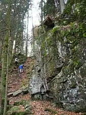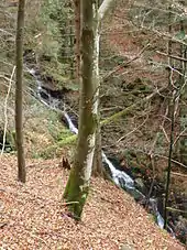 The Hirschbach Falls (German: Hirschbachfälle) lie between St. Peter and Simonswald in that part of the High Black Forest, which is also considered part of the Central Black Forest. The main cascade, which is just under 20 metres high, falls into the Hirschbach stream in an ice age cirque in the valley of Simonswälder Tal, where it empties into the Zweribach, a tributary of the Wild Gutach. Another smaller waterfall lies 300 metres upstream.