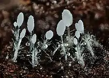 The hairs on the stem are straight and point away from the substrate, emerging from the stems at oblique angles. They are 150 to 250 μm in length; at the base, they are 1.5 to 2.5 μm in width, while at the rounded to club-shaped tips, they are 3 to 4.5 μm in width. The hairs do not branch, have moderately thick walls and are somewhat septate. Individual cells in the hairs measure 10 to 30 μm in length.[5]