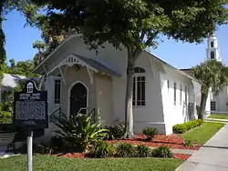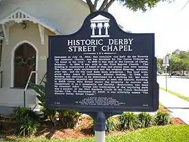 The Historic Derby Street Chapel, also known as Derby Street Chapel, is a historic church building located at 121 Derby Street in Cocoa, Brevard County, Florida. Built between 1916 and 1920 as a Seventh-day Adventist church, it was sold to First Church of Christ, Scientist, Cocoa in 1955. In 1964 the Christian Science sold it to the First Baptist Church of Cocoa, which still owns it. Cocoa Mainstreet, which holds a 25-year lease on the property, renovated the building and brought it up to current handicapped access standards. It is now a venue for weddings, vow renewals, memorials and other small events. [2] [3] [4]