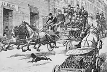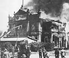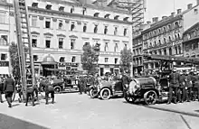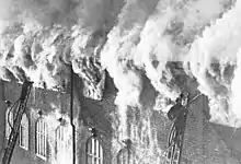 One of the worst fires the Stockholm Fire Brigade experienced since its formation in 1875 was a fire in 1937 in the central dairy at Torsgatan.[18] The fire broke out on February 8, 1937, caused by a welder working in the attic above the fourth floor.[19] He first attempted to extinguish the fire himself, but failed. The fire brigade was alerted and quickly arrived on the site. The men not only had to fight the fire, but also work under difficult conditions, including heavy ice (the temperature was 10 degrees below zero) and a wax layer of 3,500 kg, which began to melt and burn, and hindered the firefighters considerably. Two firefighters were cut off by the fire. One hung outside a window and fell, later dying of his injuries. The other was rescued at the last minute. Some acetylene cylinders exploded, injuring another firefighter. A stairwell threatened to collapse and officers had to withdraw the men. In the end, all of Stockholm's firefighters engaged in fire extinguishing, and all the firefighters were called to duty. In total, there were 70 people on the site, including managers, the fire chief, firefighters, and teachers from officers' school.[18] Only after seven hours was the fire considered to be under control. The damage cost over a million dollars and Stockholm's milk supply was threatened.