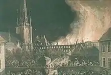 Despite all precautions and new regulations, large fires continued to break out in Stockholm. Approximately 200 houses burned down in Norrmalm in 1719, while the Catherine fire in 1723 destroyed 500 houses,[5] as well as other buildings and the Katarina Church on Södermalm.[1] On the night of May 1, 1723, a fire began in a mill in the Maria Church and spread eastward, resulting in the collapse of the Catherine Church dome and the tower.[5]