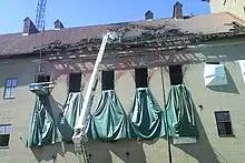 At two o'clock on the night of June 5, 2008, a fire broke out on the third floor of Town Hall's west wing. It took up to 70 firefighters about three hours to control. The fire in the Town Hall was dramatic and, when emergency services arrived at the building, it was a fully developed fire, five- to 10-foot-high flames reached out of the windows. The fire department estimated that the entire third floor of the south wing was destroyed by fire. Since renovation work was being carried out, the building was empty and no people were hurt.