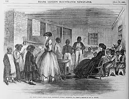 The federal government through the Freedmen's Bureau, a part of the U.S. Army, created a vast network of schools in camps it operated for freed Blacks. Much of the leadership came from Northern blacks who had never been slaves who moved South. The African-American community engaged in a long-term struggle for quality public schools. Historian Hilary Green says it "was not merely a fight for access to literacy and education, but one for freedom, citizenship, and a new postwar social order."[3] The black community and its white supporters in the North emphasized the critical role of education is the foundation for establishing equality in civil rights.[4] Anti-literacy laws for both free and enslaved black people had been in force in many southern states since the 1830s,[5] The widespread illiteracy made it urgent that high on the African-American agenda was creating new schooling opportunities, including both private schools and public schools for black children funded by state taxes. The states did pass suitable laws during Reconstruction, but the implementation was weak in most rural areas, and with uneven results in urban areas. After Reconstruction ended the tax money was limited, but local blacks and national religious groups and philanthropists helped out.