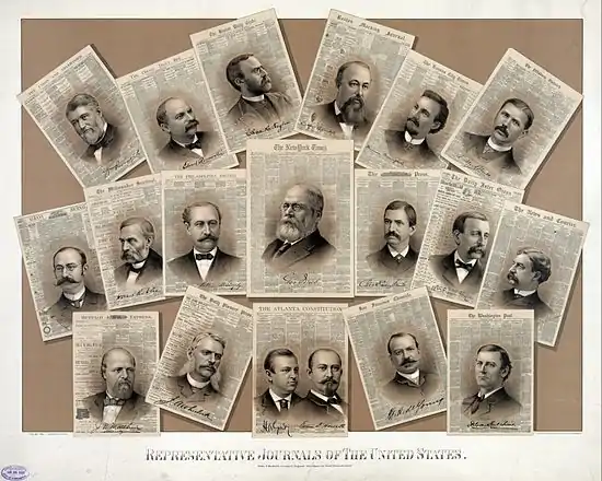 Middle row: Albany Evening Journal (John A. Sleicher) - The Milwaukee Sentinel (Horace Rublee) - The Philadelphia Record (William M. Singerly) - The New York Times (George Jones) - The Philadelphia Press (Charles Emory Smith) - The Daily Inter Ocean (William Penn Nixon) - The News and Courier (Francis Warrington Dawson).