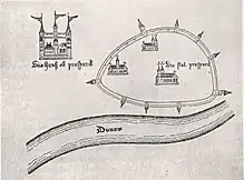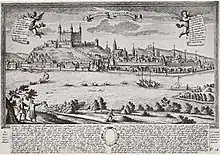 The town (the part below the castle) was conferred its first (known) town privileges by the Hungarian king Andrew III in 1291.[11] Earlier town privileges are not known, but probable, because Pressburg has been called a "town" as early as around 1250. After 1291, the town received many privileges from Hungarian kings, especially from the emperor Sigismund in the 15th century. After the death of the Hungarian king Andrew III, Pressburg was annexed by Austria in 1301, because Andrew's widow gave the town to the Habsburgs. The Habsburgs returned it to Hungary in 1322, but occupied it again later. It is only in 1338 that the town finally became part of Hungary again. In 1405 the town was declared a free royal town by King Sigismund of Luxemburg.[12] Not only Pressburg but all towns in Hungary got this status (meaning that they received "collective nobility", i.e. the status of a feudal lord with all its privileges) because Sigismund wanted to restrain the increasing power of the (true) feudal lords in Hungary. The Hussites first appeared in 1428, when they burned down the suburbs of Pressburg. Negotiations held a year later in Pressburg between Sigismund of Luxemburg and the Hussites (in April and in June) failed. Between 1432 and 1434 the Hussites tried to conquer the city but their attacks failed. The first bridge over the Danube in Pressburg was built in 1434, but it was destroyed by floods next year.[13] In 1434 and 1435 the amount of paymentsby Hungary, for which the Hussites would leave Slovakia, was officially negotiated. In 1436 Sigismund of Luxemburg awarded Pressburg the right to use its own coat of arms[14] and orders to improve the fortification of the castle (because of the last Hussite invasion during that year). From 1439 to 1486 another bridge over the Danube existed in Pozsony, being washed away by flood in 1486.[15]