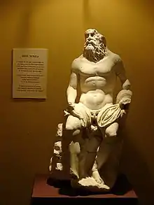 Roman Carmo's early remains are buried in the area extending from the present Ayuntamiento to the Plaza de Abastos, where a late neolithic dolmen was discovered in 1888.[3] Some graves from the Carthaginian period dating to the 5th century have been found as well. The name of a certain Urbanibal, a person of Carthaginian descent who lived during the Roman period, is preserved on a funeral urn discovered in the Roman cemetery and now displayed in the Carmona City Museum (Museo de la Ciudad de Carmona).[38] The bodies were cremated in crematories excavated in the rock, where the funeral pyre stood. Sometimes these crematories were also used for burials; the ashes were deposited in them, then they were covered with stone blocks, bricks, and tegulae. A stele was placed to indicate their location and the name of the deceased.[39] [40]