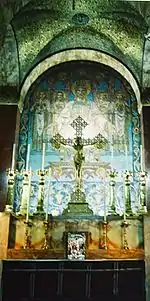 St Lewinna, or St Leofwynn, was a female saint who lived around Seaford, probably at Bishopstone around the 7th century. According to the hagiography of the Secgan Manuscript, Lyminster is the burial place of St Cuthflæd of Lyminster.[14][15] In the late 7th or early 8th century, St Cuthman, a shepherd who may have been born in Chidham and had been reduced to begging, set out from his home with his disabled mother using a one-wheeled cart.[16] When he reached Steyning he saw a vision and stopped there to build a church.[16] Cuthman was venerated as a saint and his church was in existence by 857 when King Æthelwulf of Wessex was buried there.[16] Steyning was an important religious centre and St Cuthman's grave became a place of pilgrimage in the 10th and 11th centuries.[14][15][16] In 681, Bede records that an outbreak of the plague had devastated parts of England, including Sussex, and the monks at Selsey Abbey fasted and prayed for three days for an end to the outbreak. A young boy with the plague prayed to St Oswald and his prayers were answered, and a vision of St Peter and St Paul was said to have appeared to the boy, telling him that he would be the last to die.[17]