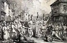 Mary's persecution of Protestants earned her the nickname "Bloody Mary".[39] Nationally about 288 Protestants were burnt at the stake during her reign, including 41 in Sussex.[30] Most of the executions in Sussex were at Lewes. Of these 41 burnings, 36 can be identified to have come from specific parishes, and the place of execution is known for 27 of them; because the details of the executions were recorded in the Book of Martyrs by John Foxe, published in 1563.[41] Martyrs included Deryck Carver, a French-speaking Flemish man who had sought refuge in Brighton from persecution for his Calvinist beliefs; and Richard Woodman, an ironmaster from Buxted. There are Bonfire Societies in Sussex that still remember the 17 Protestant martyrs that burned in Lewes High Street, and in Lewes itself they have a procession of martyrs' crosses during the bonfire night celebration.[42] According to Quinn, the authorities in Sussex during Mary's reign were rather less bloodthirsty than is generally assumed, often allowing their opponents to slip the noose when they could.[43] Carver's meetings had been attended by many fishermen from both England and France, beginning the tradition of French Christian worship in Brighton.