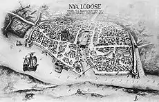 As at Charles IX's Gothenburg, the majority of the initial inhabitants of Gustav Adolf's Gothenburg were immigrants, and above all from the Dutch Republic. Indeed, the initial city council comprised ten Dutchmen, seven Swedes and one Scot.[16] Dutch builders were contracted to plan the new city and construct its fortifications, in part because of their expertise in building on marshland. In order to drain the swampy ground and provide access for shipping, Gothenburg was given a network of canals, akin to those of Dutch cities like Amsterdam, and indeed it appears the plans for the canal network were modelled on those used for the recent Dutch colonial settlement of Batavia (modern Jakarta, Indonesia).[17] The Dutch influence over Gothenburg in its early decades was so strong that it was sometimes regarded as a Dutch colony on Swedish soil; for example one contemporary writer described it as, Gotheburg ab Hollandis aliisque Belgis incolitur ('Gothenburg, inhabited by Hollanders and other Belgians')[18][19]