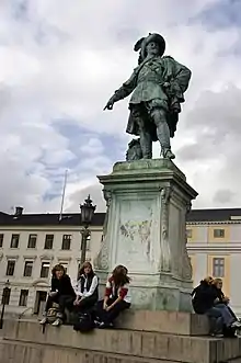 In 1621, King Gustav II Adolf, the son and successor of Charles IX, decided to make yet another attempt at founding a city on the Göta Älv. According to legend, the king was searching for a suitable location when suddenly a dove fleeing from an eagle landed at his feet, seeking shelter. Gustav took this as a sign from God and declared, Här skall staden ligga! ('Here shall the city lie!').[15] In order to ensure the new settlement did not suffer the same fate as its predecessors, it was provided with a substantial network of fortifications, later augmented by the twin fortresses of Skansen Kronan and Skansen Lejonet.