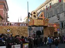 In 1564 the seal of the Marinese community appeared for the first time, depicting a knight carrying a banner (which basically remained unchanged over the centuries);[63][64] in 1566 the new "Statutes" were issued,[52] and in 1572 the "Bandi, provisioni et ordinationi" on gambling, blasphemy and brawling:[63] both documents were lost as a result of the Anglo-American bombings that devastated the municipal archives during World War II;[65] also in 1566, the construction of Palazzo Colonna was one-quarter complete, including the peperino entrance staircase,[63] and the new thoroughfare of Via Roma was fully inhabited.[63]