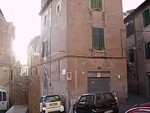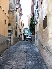 In the late Middle Ages the village expanded progressively southeastward along the peperino hill on whose summit -373 m a.s.l., today Piazza Giacomo Matteotti- the Frangipane family had a four-sided fortress built, demolished at an unspecified time and of which three round towers remain incorporated in the surrounding buildings. The new expansion corresponds to the present districts of Santa Lucia and Coste, and was traversed by the important thoroughfare of Via Santa Lucia and Via Posta Vecchia: the denomination of the latter street denounces that most likely this was originally the route of the courier and postal route between Rome and Naples, which passed through Marino until the 1780s.[37]