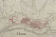 As already mentioned, in the Republican age in the territory of the first district of Marino arose the Roman colony -then municipium[2]- of Castrimoenium, as confirmed by Gaius Plinius Secundus in the Naturalis Historia[20] and Sextus Julius Frontinus, in De Coloniis.[21] The existence of Castrimoenium is proven by numerous inscriptions and tombstones found throughout the territory of the first district of Marino, which would lead to the exclusion of the coincidence of Castrimoenium with the Castra Albana founded around 183 by Septimius Severus in the place of the present-day city of Albano Laziale, a coincidence assumed by some historians.[22] The archaeological controversy thus revolves around the location of the castrum in question near the locality Castel de' Paolis[23] -at the municipal borders with Grottaferrata and Ciampino- or near the historic center of Marino, in the Castelletto district.[24] Both place names have to do with the ancient toponym, and in both places abundant finds of Roman materials have been made: however, while for Castel de' Paolis the Roman remains are believed to belong to a suburban villa of the imperial age owned by the patrician family of Scribonii-Libones,[2] for Castelletto it is more plausible that a settlement of military origin such as Castrimoenium stood there, since much of the current alleys of the ward retain the characteristic orthogonality of Roman castra.