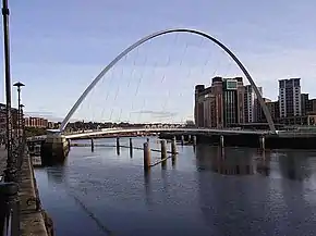 The Gateshead Millennium Bridge, a foot and cycle bridge, 26 feet (7.9 m) wide and 413 feet (126 m) long, was completed in 2001. The road deck is in the form of a curve and is supported by a steel arch. To allow ships to pass, the whole structure, both arch and road-deck, rotates on huge bearings at either end so that the road deck is lifted. The bridge can be said to open and shut like a human eye. It is an important addition to the re-developed quayside area, providing a vital link between the Newcastle and Gateshead quaysides.[6]