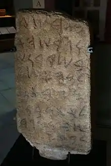 The Phoenicians also continued to maintain cultural and commercial links with their western counterparts. Polybius recounts how the Seleucid king Demetrius I escaped from Rome by boarding a Carthaginian ship that was delivering goods to Tyre.[68] An inscription in Malta, made between the second and third centuries BC, was dedicated to Herakles/Melqart in both Phoenician and Greek. To the extent the Phoenicians were subject to some degree of Hellenization, "there was much continuity with their Phoenician past—in language and perhaps in institutions; certainly in their cults; probably in some sort of literary tradition; perhaps in the preservation of archives; and certainly in a continuous historical consciousness."[69] There is even evidence that a Hellenistic-Phoenician culture spread inland to Syria.[70] The adaptation to Macedonian rule was likely aided by the Phoenician's historical ties with the Greeks, with whom they shared some mythological stories and figures; the two peoples were even sometimes considered "relatives".[71]