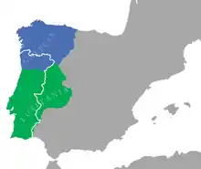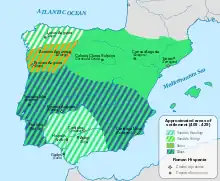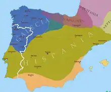 The Kingdom of the Suebi[47] was the Germanic post-Roman kingdom, established in the former Roman provinces of Gallaecia-Lusitania. 5th-century vestiges of Alan settlements were found in Alenquer (from old Germanic Alan kerk, temple of the Alans), Coimbra and Lisbon.[48]