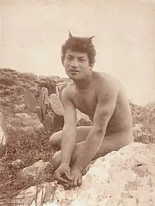 It was in 1878 that Geleng's countryman Wilhelm von Gloeden took up residence in the town and changed its destiny. He spent most of his career as a photographer, of landscapes and of male nudes, both of which drew more attention to Taormina. "Largely as a consequence of his photographs' popularity, the town became a tourist resort with good hotels."[21] Gloeden learned from and worked with two Italian photographers, Giovanni Crupi (1859–1925) and Giuseppe Bruno (1836-1904). Edward Chaney, an expert on the evolution of the Grand Tour and of Anglo-Italian cultural relations, described the town as attracting "male refugees from more repressive climates";[22] the Labouchere Amendment, under which Oscar Wilde had in 1895 been sentenced to two years' hard labour, made Britain particularly risky to live in. Von Gloeden's studio drew high-ranking clientele: on one day in 1904, his visitors' book was signed by Kaiser Wilhelm II as well as Philipp, Prince of Eulenburg and Kuno von Moltke (of the Harden–Eulenburg affair).[23]