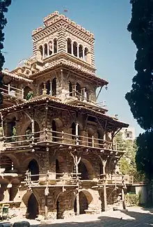 In 1905, the English artist Robert Hawthorn Kitson, heir to Kitson and Company but driven from Britain by homophobia, built a house in Taormina.[35] He commissioned Frank Brangwyn to design murals and furniture for the Casa Cuseni. Alfred East also contributed.[36] In 1907, the English architect C. R. Ashbee, a prime mover of the Arts and Crafts movement, came to Taormina on commission from an old client. Colonel Shaw-Hellier set him the task of designing the Villa San Giorgio,[37][38] Biographer Fiona MacCarthy judges it "the most impressive of Ashbee's remaining buildings";[39] it is run as the Hotel Ashbee. In 1911 Alexander Hood, 5th Duke of Bronté began building a house, La Falconara, on his grandmother's land.[20] Alex Hood was, like his father, a discreet courtier, and unlike his father, discreetly homosexual as well. With his close friend and frequent guest the writer Robert Hichens (best known for The Green Carnation (1894), a satire of Hichens's friends Wilde and Bosie), Hood helped to further establish Taormina (like Capri) as a "holiday resort for wealthy homosexuals from Northern Europe", as historian Lucy Riall put it.[40] One such escapee, Albert Stopford, the art dealer and confidant to royalty, cultivated roses in his Edwardian garden.