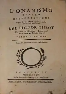 One of the many horrified by the descriptions of malady in Onania was the notable Swiss physician Samuel-Auguste Tissot. In 1760, he published L'Onanisme, his own comprehensive medical treatise on the purported ill-effects of masturbation.[22] Citing case studies of young male masturbators amongst his patients in Lausanne, Switzerland as basis for his reasoning, Tissot argued that semen was an "essential oil" and "stimulus", the loss of which in great amounts would cause "a perceptible reduction of strength, of memory and even of reason; blurred vision, all the nervous disorders, all types of gout and rheumatism, weakening of the organs of generation, blood in the urine, disturbance of the appetite, headaches and a great number of other disorders."