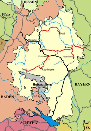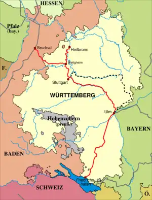 The direct route Bretten–Stuttgart–Ulm developed into the most important railway axis in Württemberg, and it came to be known as the Hauptbahn (Main line).[1]