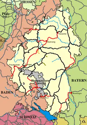 Any additional expansion of the rail network required negotiations with neighbouring states. Along with Bavaria and Baden, these states included Prussia, whose territory of Hohenzollern bordered on Württemberg, and Hesse, whose exclave Wimpfen was situated between Baden and Württemberg.