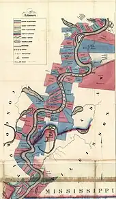 Land in Mississippi was river bottomland rich in organic matter— "the Mississippi and Yazoo, the Tombigbee, Big Black, and the Pearl covered an area of over one-sixth of the entire state and offered unrivalled soil"[5]—and this land was primarily used to grow the highly valuable cash crop cotton produced with the labor of hundreds of thousands of enslaved American laborers of African descent. According to David Walker Howe in What Hath God Wrought, overseas cotton sales in 1836 exceeded US$71,000,000 (equivalent to $1,892,042,424 in 2022), and by 1840, the cotton crop was 59 percent of the total value of U.S. exports.[6] Mississippi cotton was a strain produced by crossing a large-bolled variety from Mexico with a green-seed variety from Tennessee that "grew better on piedmont and interior lands" than sea island cotton.[3] The land clearance and plowing necessary to create thousands of acres of monocrop cotton plantations was ultimately debilitating to the soil, the river, and the native ecosystem.[7]