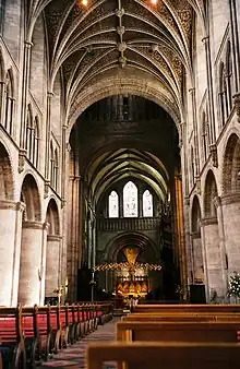 The most significant reform in Edward's reign was the adoption of an English liturgy to replace the old Latin rites.[46] The doctrine of justification by faith is implicit throughout the 1549 Book of Common Prayer,[47] but the Catholic doctrines of transubstantiation and the sacrifice of the Mass are rejected.[48] Nevertheless, many reformers complained that the prayer book was too traditional. The 1552 Book of Common Prayer was explicitly Protestant, going so far as to deny the real presence.[49][50] John Hooper refused to be consecrated a bishop while wearing the required vestments (a black chimere over a white rochet) igniting the first vestments controversy, which was essentially a conflict over whether the Church could require people to observe ceremonies that were neither necessary for salvation nor prohibited by scripture.[51]