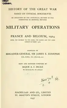The History of the Great War Based on Official Documents by Direction of the Committee of Imperial Defence (abbreviated to History of the Great War or British Official History) is a series of 109 volumes, concerning the war effort of the British state during the First World War. It was produced by the Historical Section of the Committee of Imperial Defence from 1915 to 1949; after 1919 Brigadier-General Sir James Edmonds was Director. Edmonds wrote many of the army volumes and influenced the choice of historians for the navy, air force, medical and veterinary volumes. Work had begun on the series in 1915 and in 1920, the first volumes of Naval Operations and Seaborne Trade, were published. The first "army" publication, Military Operations: France and Belgium 1914 Part I and a separate map case were published in 1922 and the final volume, The Occupation of Constantinople was published in 2010.