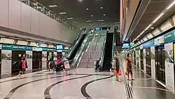 The Downtown Line is the fifth Mass Rapid Transit line in Singapore and opened in three stages, on 22 December 2013,[18] 27 December 2015 and 21 October 2017 respectively. When fully completed, the line will be about 44 km (27 mi) long with 36 stations and serve about half a million commuters daily,[19] making it the longest underground and driverless MRT line in Singapore. Travelling from one end to the other will take about 65 minutes.