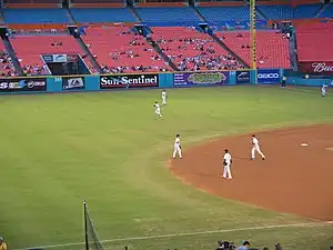 2006 Rebuilt Marlins taking the field in front of a sparse crowd. (counter clockwise) Hermida, Ross, Uggla, Ramírez, and Willingham